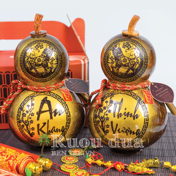 Rượu dừa hồ lô An Khang – Thịnh Vượng là một trong những sản phẩm quà tết nổi bật của năm 2019 với những hoa văn thư pháp khắc họa lên những câu chúc năm mới mang đến nhiều may mắn AN KHANG- THỊNH VƯỢNG