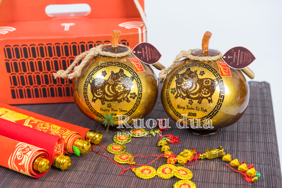 Rượu dừa Kỉ Hợi 3 là sản phẩm rượu dừa tết đặc biệt 2019 với những đường nét hoa văn thư pháp điêu luyện khắc họa bức tranh và những câu chúc năm mới mang đến nhiều may mắn trong năm Kỉ Hợi